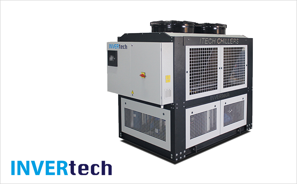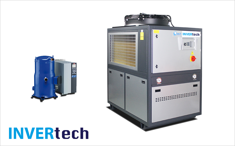 Invertech is equipped with single or twin refrigeration circuits, driven with inverter compressors running according to the exact cooling load. Precise control of peak load conditions, reduces energy consumption all year around. Electronic expansion valve meters, proper amount of refrigerant flow to evaporator according to suction gas pressure and temperature. Invertech scroll inverter compressors running with R410 refrigerant ensure exact temperature readings. Invertech has the best temperature control technology, the industry can provide by variable speed compressors. Condenser surface is generously sized for comfortable operation at higher ambient temperatures.Inverter compressor solution with variable speed drive, ensures excellent performance values while maintaining secure oil management during the compressor life time. Invertech guarantees better noise levels as opposed to standart units due to variable speed drive of fan, compressor and water pump.